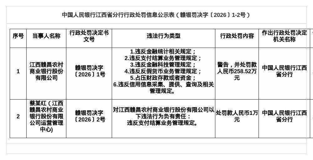 蓝鲸新闻1月23日讯,近日,中国东谈主民银行江西省分行发布行政处罚信息公示表,剑指江西赣昌农村交易银行股份有限公司及相干背负东谈主。