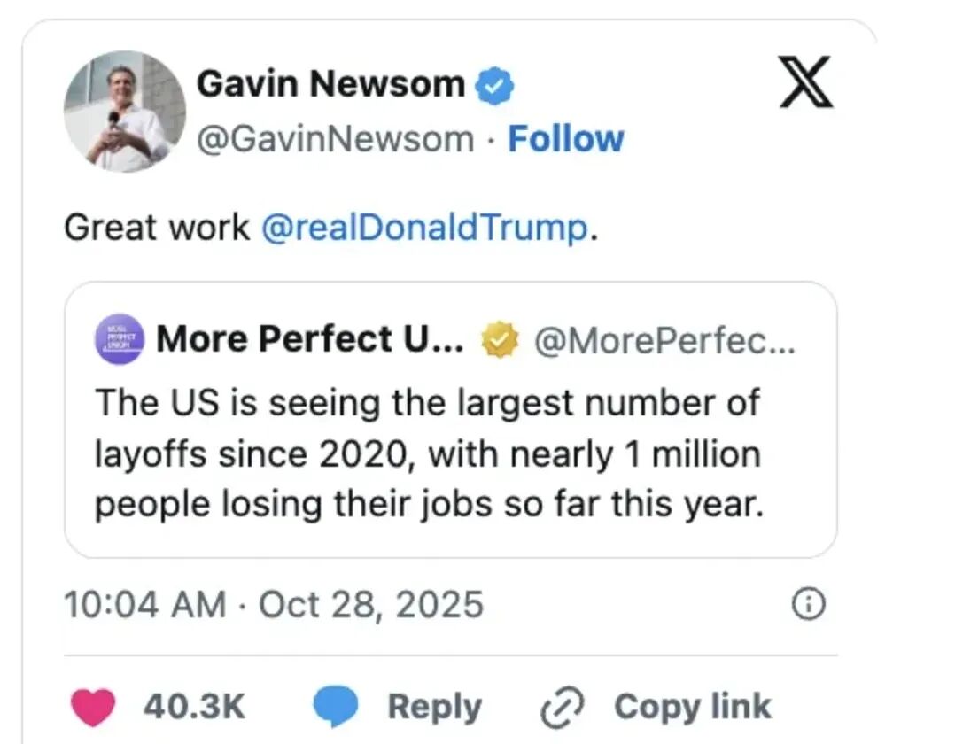 加州州长 Gavin Newsom 以至转发一条写着“好意思国正在履历2020年以来的最大裁人潮已有近100万东谈主休闲”的推特并讪笑称:“特朗普干得漂亮。”