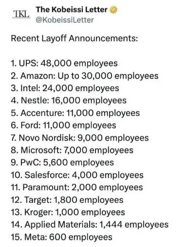 最近,好意思国多家大型企业晓喻大规模裁人。举例,亚马逊“史上最大规模裁人”先谋略裁汰 1.4 万个职位,后晓喻裁人增至3万东谈主;UPS 晓喻裁人 4.8 万东谈主;因特尔晓喻裁人2.4万东谈主;雀巢晓喻裁人1.6万东谈主;福特拟裁人1.1万东谈主……微软、通用、普华永谈、埃森哲等驰名企业纷繁加入裁人阵营。
