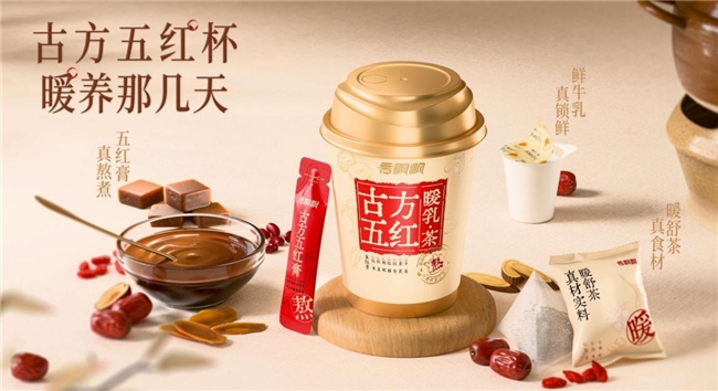 动作两边聚合研发的首款居品,香飘飘古方五红暖乳茶以“五红汤”“当归补血汤”等经典名方为基础,甄选多种药食同源食材,通过8谈非遗熬膏工艺、72小时制成“古方五红膏”,并搭配暖舒茶包与牛乳锁鲜杯,让浮滥者在一冲一泡的方便中,体验善良调整的饮用形势。“这么的策画,既保留了传统补养的精华,又契合当代浮滥者对方便性、口感和个性化的需求。”飘飘品牌立异总司理蒋晓莹暗意。
